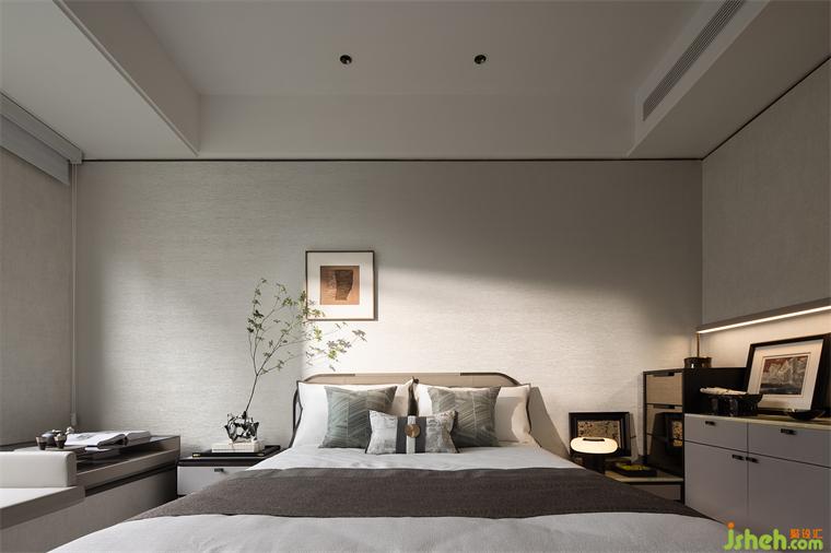 主臥套間是回歸身心的私屬天地,開闊明亮的布局正是悠然自在的外顯,樣板房設計特色墻布、木飾面與仿皮革飾面的材質碰撞,在尺度與品質間,鋪陳出怡然自得之感。