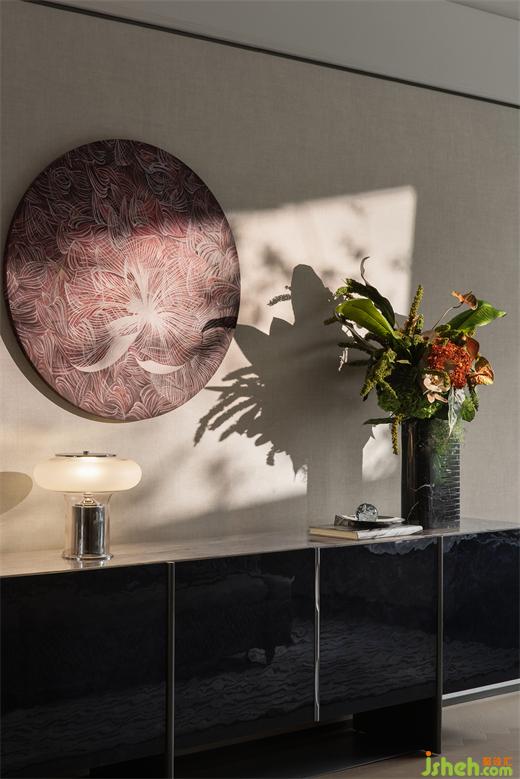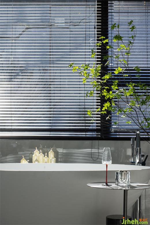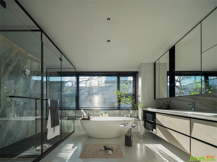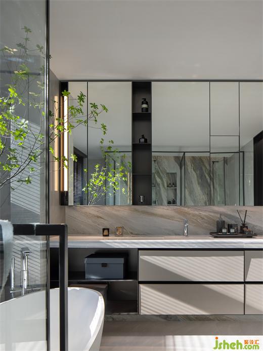 主衛(wèi)內(nèi)碧??{(lán)巖板蔓延,如緩緩流淌的河水,樣板房設(shè)計(jì)營造出寧靜之地,于干練、精致中感受燈光、質(zhì)地、肌理的交融。沐浴之際,向外望去,風(fēng)光旖旎。