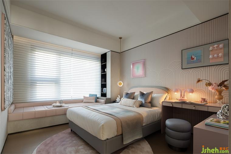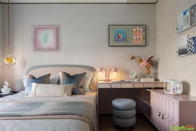 在簡(jiǎn)潔幾何形的壁紙鋪就下,加以線性吊燈的點(diǎn)綴,提升了女兒房的整體層次,雖有繽紛色彩,卻多而不繁,溫柔細(xì)膩的基調(diào)筑造起公主夢(mèng)幻般的小天地,自然流淌出的粉嫩與愜意在此輕柔相遇,溫潤(rùn)了時(shí)光。
