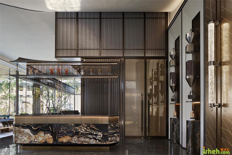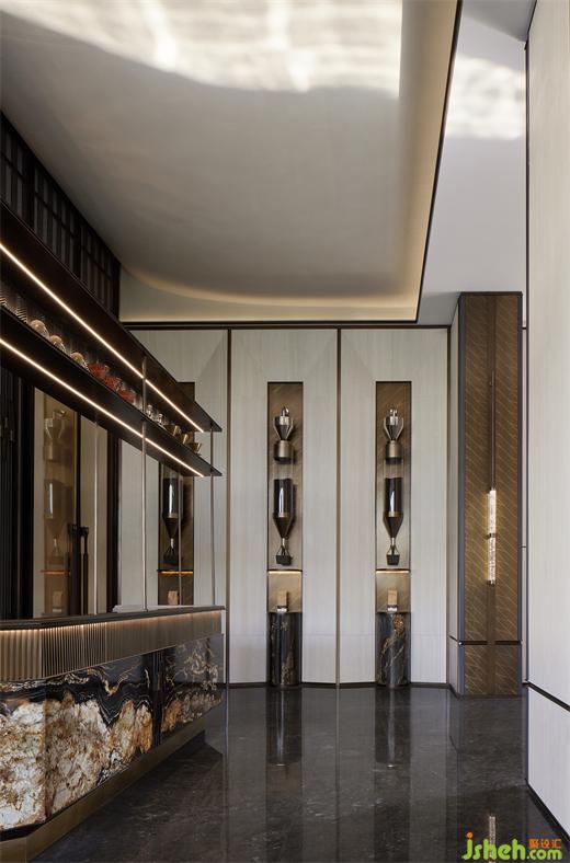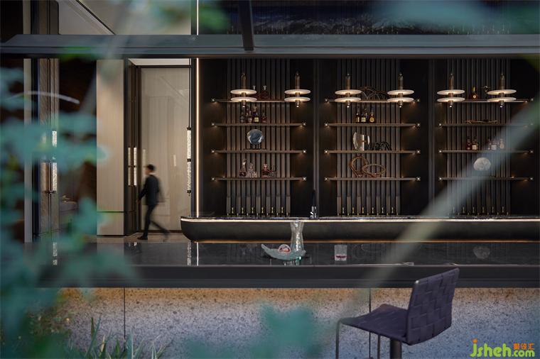 物以載道是中國傳統(tǒng)的思想與文化特征。艾未設(shè)計(jì)亦注重取其形,彰其意,以黑金石材的吧臺(tái)做底,令金屬架化身船槳,在弧形層架的背景之下,一支烏篷船仿佛即將隨風(fēng)啟航。