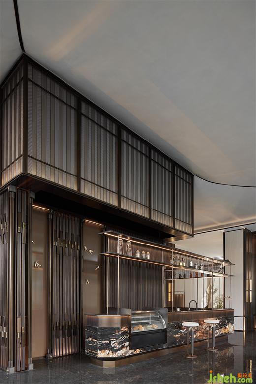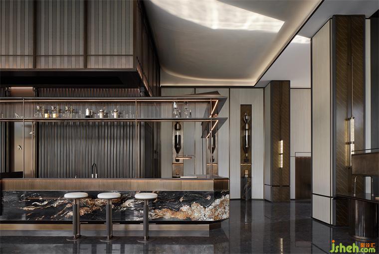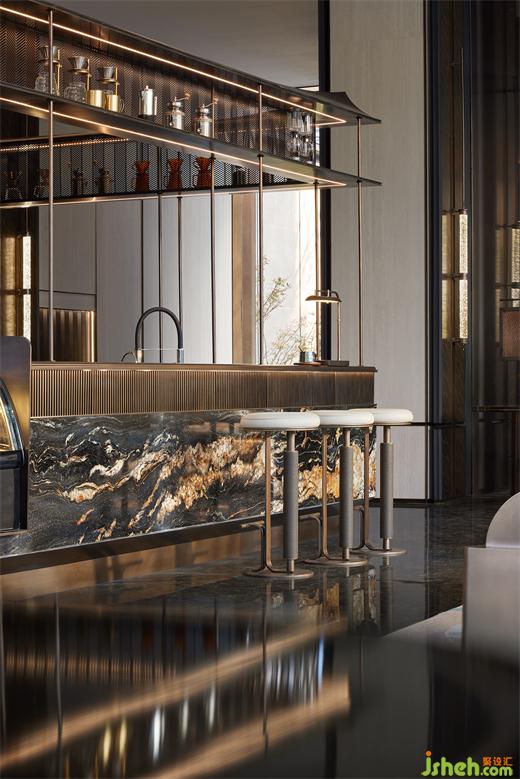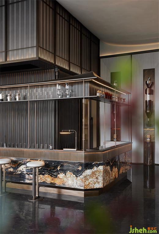 遵循中國古典的步入方式,在空間起承轉(zhuǎn)合之際,往往藏匿著一些不期而遇的驚喜。酒吧區(qū)置身于高聳的屏風(fēng)背后,吧臺(tái)呈層疊與托起的姿態(tài),優(yōu)雅的弧形與背景陣列的酒柜格架、韻律分明的吊燈交相輝映,既彰顯層次之美,又和諧一體。黑色的石材與金色的構(gòu)件搭配仿佛置身于蓋茨比時(shí)代的雞尾酒吧,展現(xiàn)出浪漫迷人之感。