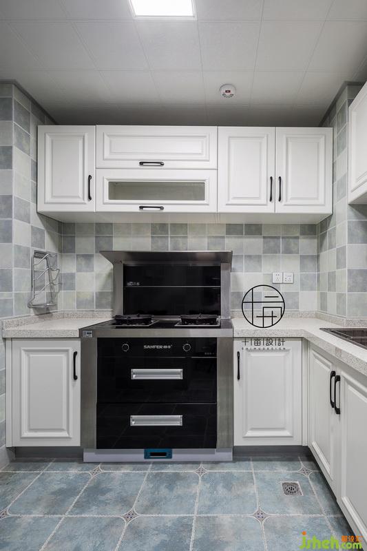 廚房藍灰色復(fù)古地磚加角花,拼色墻磚呈現(xiàn)增添視覺靈動性,白色櫥柜配灰色臺面,簡潔易打理