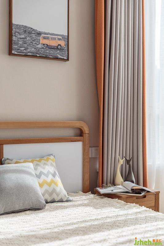 主臥延續(xù)淺咖色墻面,掛一幅抽象裝飾畫,輔以壁燈與懸掛式吊燈作臥室照明。