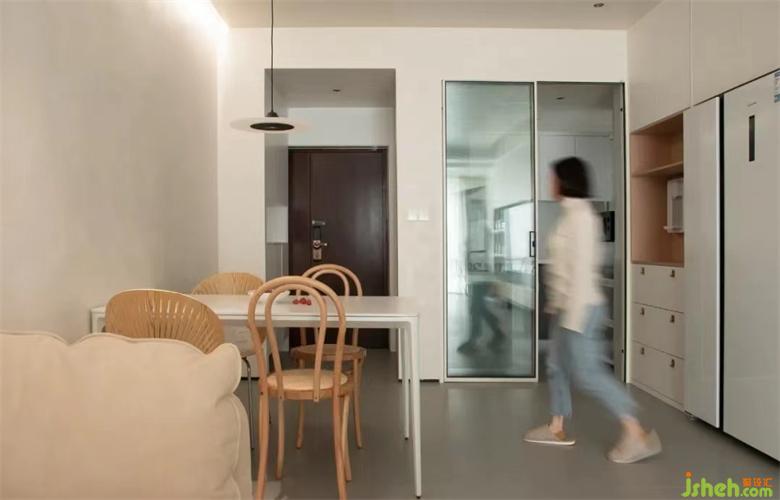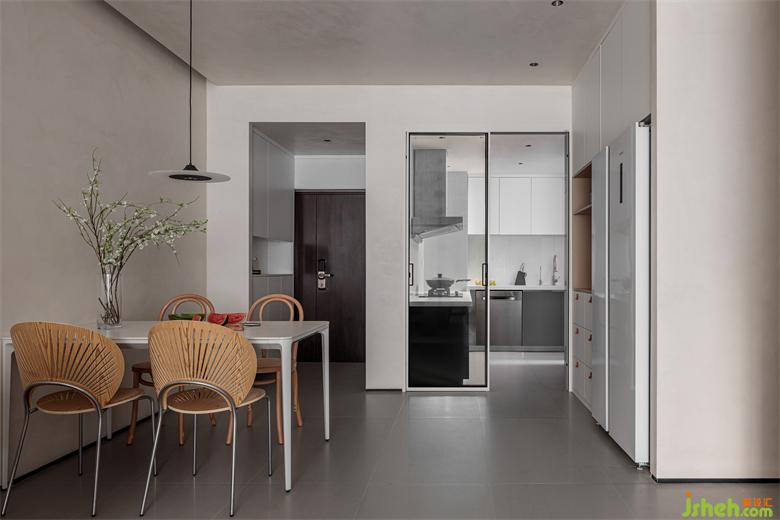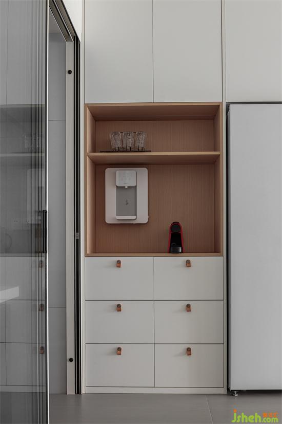 餐廳設(shè)計(jì)突出“實(shí)用”二字,餐邊柜作為廚房的輔助收納,不僅滿足日常需求,還為雙開(kāi)門冰箱留下了一席之地,在有限的空間里,解決了用餐、收納兩大問(wèn)題。