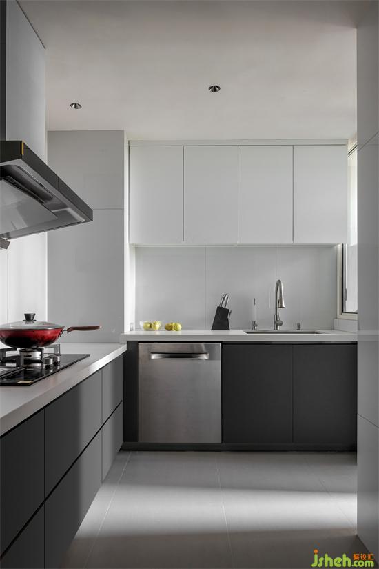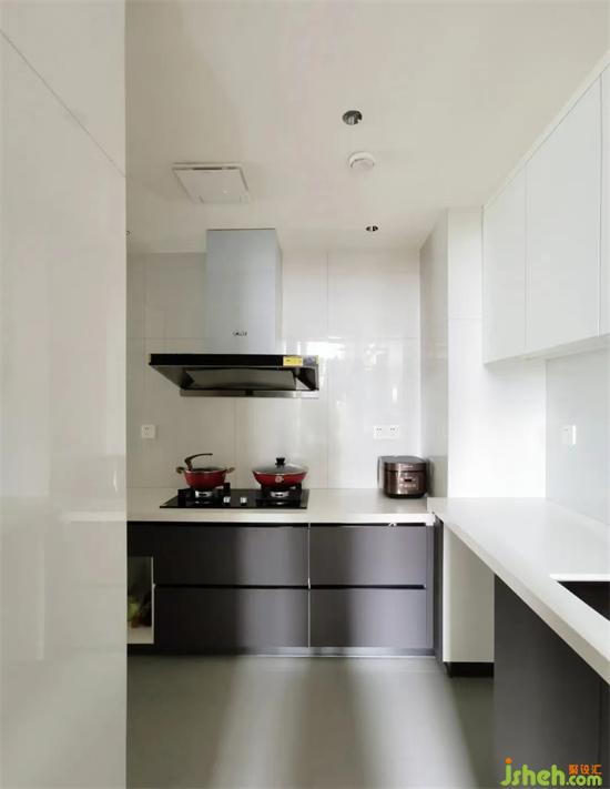 廚房色調(diào)搭配上明暗分明,黑白灰配色延續(xù)經(jīng)典。家裝設(shè)計(jì)地柜用黑色,增加厚重感與安全感。吊柜用白色,增加空間明亮度。