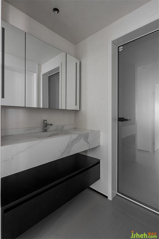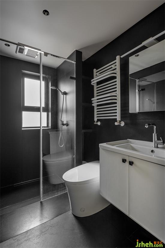 主衛(wèi)采用干濕分區(qū),空間布局更加合理。家裝設(shè)計(jì)次衛(wèi)以黑色為主,與全屋而言形成了色彩上的反差。浴室柜與潔具的選擇則是白色,鮮明的色彩對比增加了空間層次感。