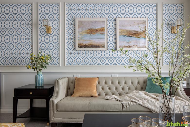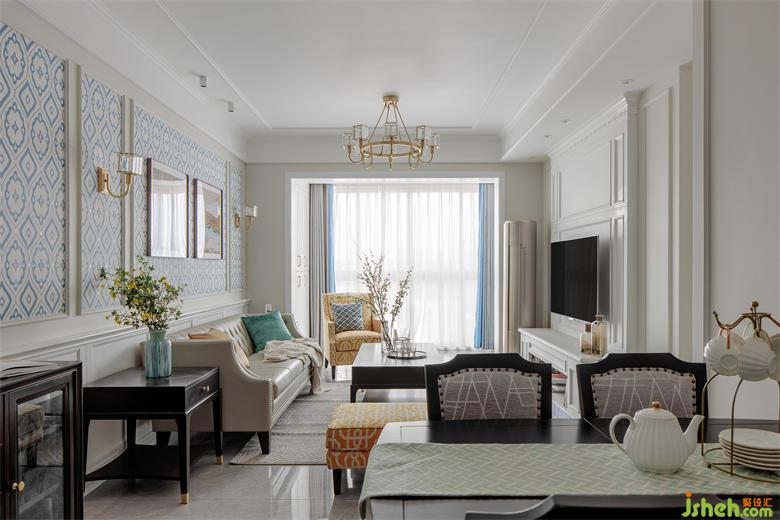 客廳以淺色系為主調(diào),簡潔流暢的吊頂設(shè)計(jì),凸顯出了空間的層次感和采光效果。家裝設(shè)計(jì)淡藍(lán)色的沙發(fā)墻設(shè)計(jì)作為背景點(diǎn)綴,別具風(fēng)情,提升了空間的鮮亮感。