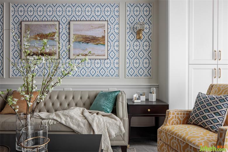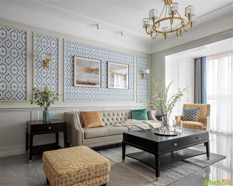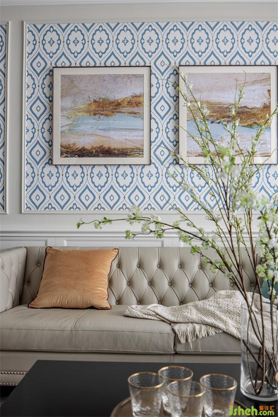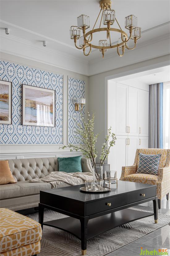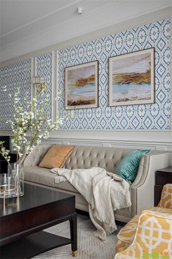 The living room with light color as the main tone, simple and smooth ceiling design, highlights the level of space and lighting effect. Light blue sofa wall design as a background ornament, unique style, enhance the bright sense of space.