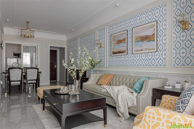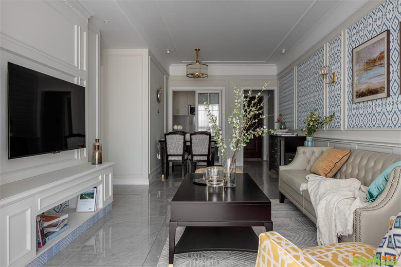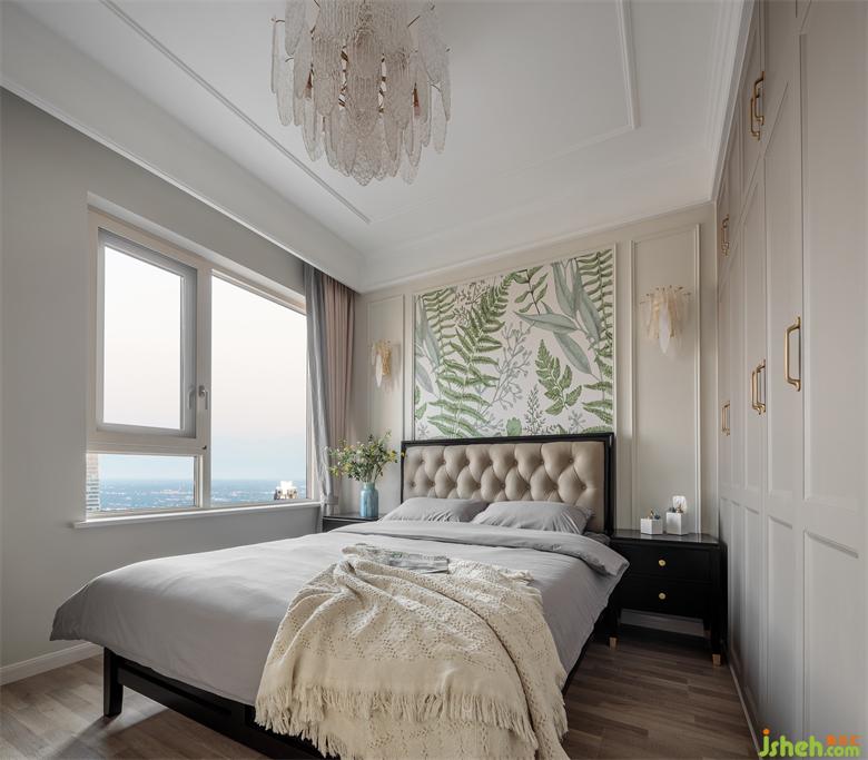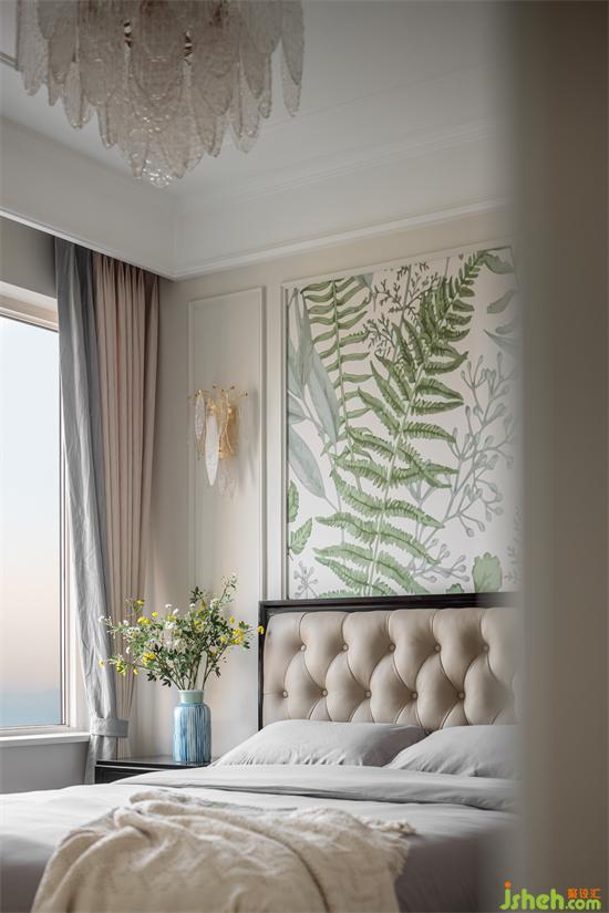 Master bedroom in the continuation of the living room light color tone at the same time, add a bit warmer milk coffee color as the wall color, more warm and soft. Bold use of a gorgeous brilliant, full sense of design of the chandelier, let people in front of a bright, excellent visual effect. The background wall is no longer conservative, and a large area of green plant pattern is chosen, which gives rise to a sense of fashion.