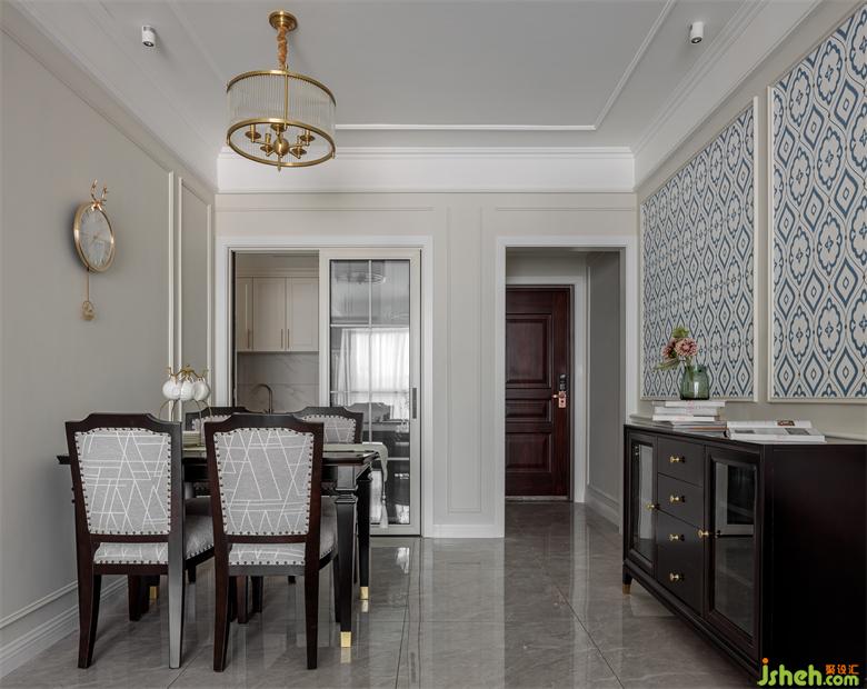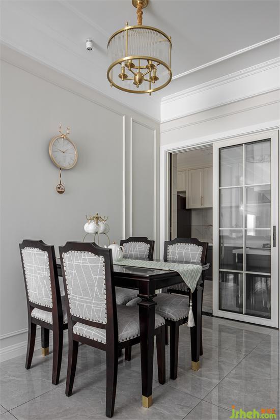 餐桌和斗柜選擇了經(jīng)典不過時的黑色,造型典雅,搭配金色拉手和腳飾,質(zhì)感拉滿。家裝設計金屬吊燈和掛鐘交相呼應,整個空間格調(diào)斐然。