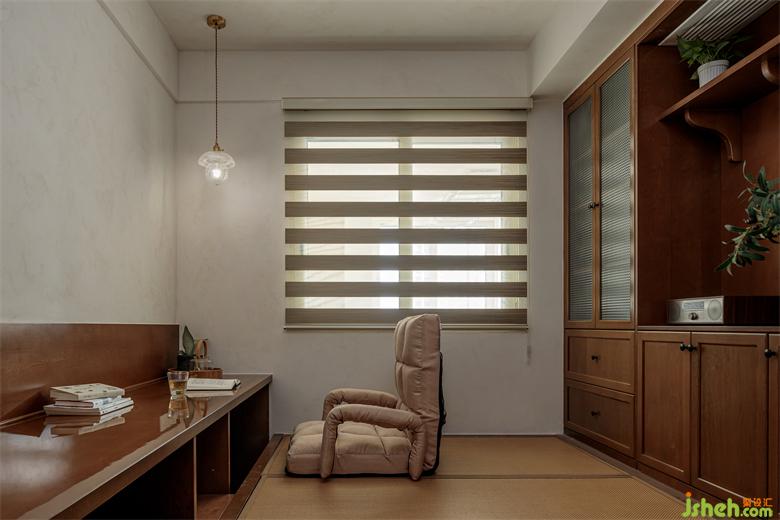 The study is designed with full room tatami. One side is the office area, the other side is the storage area, and the middle is the leisure area. It has comprehensive functions, highlighting the small and fine characteristics of tatami. The design of sunken desk can facilitate rest after work.