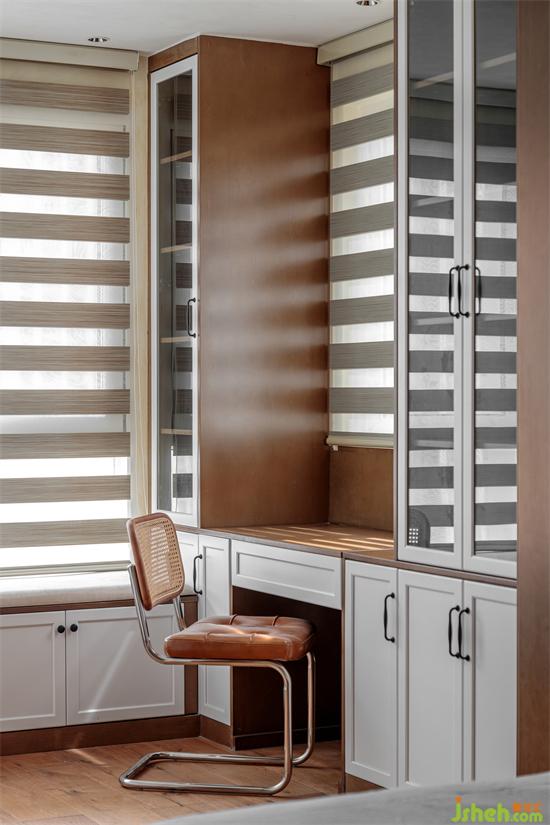 同時(shí),家裝設(shè)計(jì)在陽(yáng)臺(tái)處還定制了低儲(chǔ)物柜和書(shū)柜,更加增強(qiáng)了臥室的功能性??磿?shū)、寫(xiě)字、工作、玩電腦,都能在臥室實(shí)現(xiàn)。寬敞的衣帽間,還為牧牧(寵物)提供了一個(gè)玩耍空間。