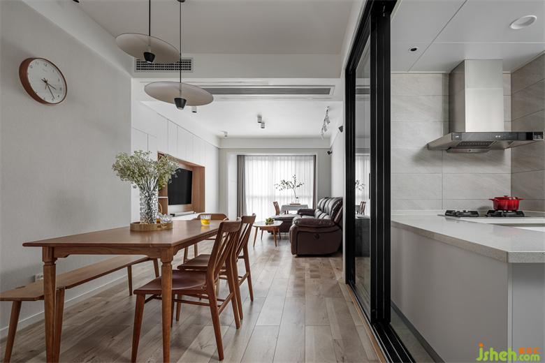 ①家裝設(shè)計(jì)打破廚房原有格局,利用移門打造多功能實(shí)用空間,實(shí)現(xiàn)了廚餐廳的聯(lián)動(dòng)。