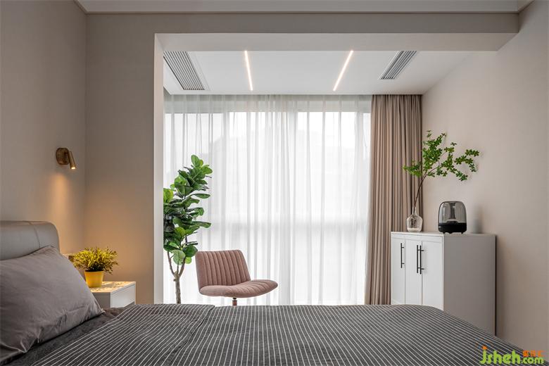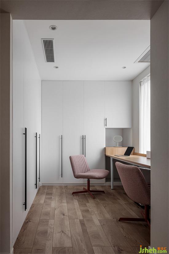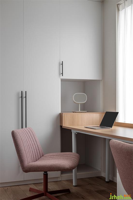 在主臥衣帽間的一角,設(shè)計(jì)了一張長(zhǎng)書(shū)桌,可滿足兩人同時(shí)使用,把每一寸空間利用到極致,家裝設(shè)計(jì)增加了區(qū)域的功能性。