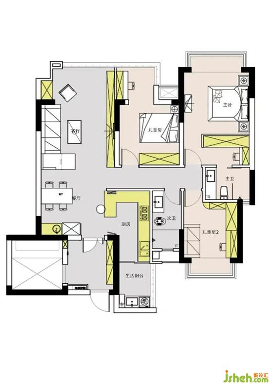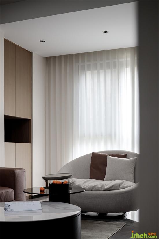 一字型地臺(tái)簡(jiǎn)約有力,與頂面的燈帶一致,增強(qiáng)了空間的視覺縱深。家裝設(shè)計(jì)通鋪亮面灰色瓷磚是精致時(shí)尚的表達(dá),精巧的設(shè)計(jì)將現(xiàn)代主義從形式的建構(gòu)到生活的審美演繹到極致。