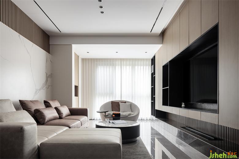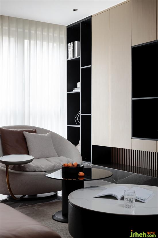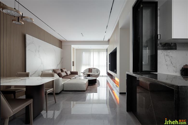 沙發(fā)背景墻采用木格欄與白色巖板相間搭配,凸顯出現(xiàn)代主義的時(shí)尚感,同時(shí)也與沙發(fā)的色彩搭配形成完美的呼應(yīng)。