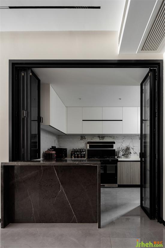 原空間布局單調(diào),缺乏創(chuàng)意,通過對屋主一家未來生活場景的了解和模擬,設(shè)計師重新規(guī)劃了動線。家裝設(shè)計島臺一臺二用,既是廚房空間的重要輔助,也是與餐廳空間的顏值隔斷。