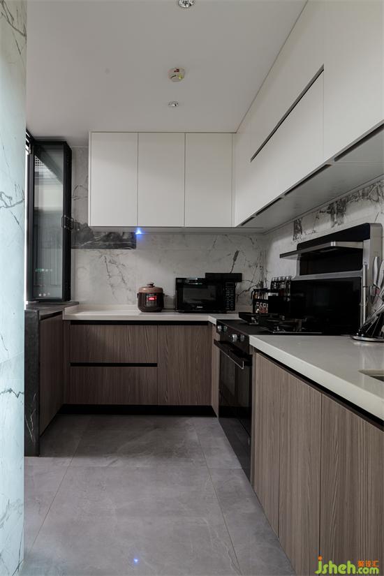 折疊門窗打破傳統(tǒng)固有的格局,家裝設(shè)計(jì)讓廚房變成半開放式,增加采光的同時(shí),也創(chuàng)造了更為多元化的彈性空間。墻磚選擇了極具張力的紋樣,在簡(jiǎn)潔的空間背景映襯下,對(duì)比更加強(qiáng)烈鮮明。