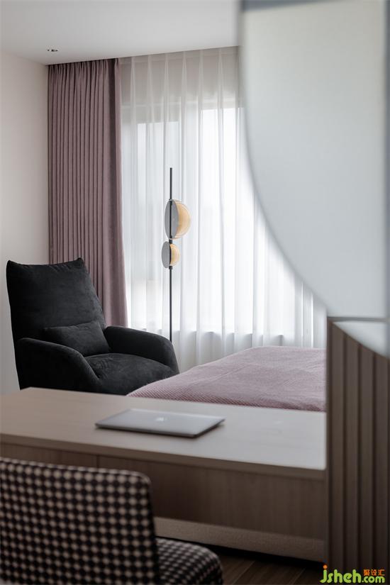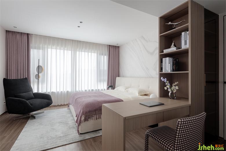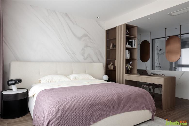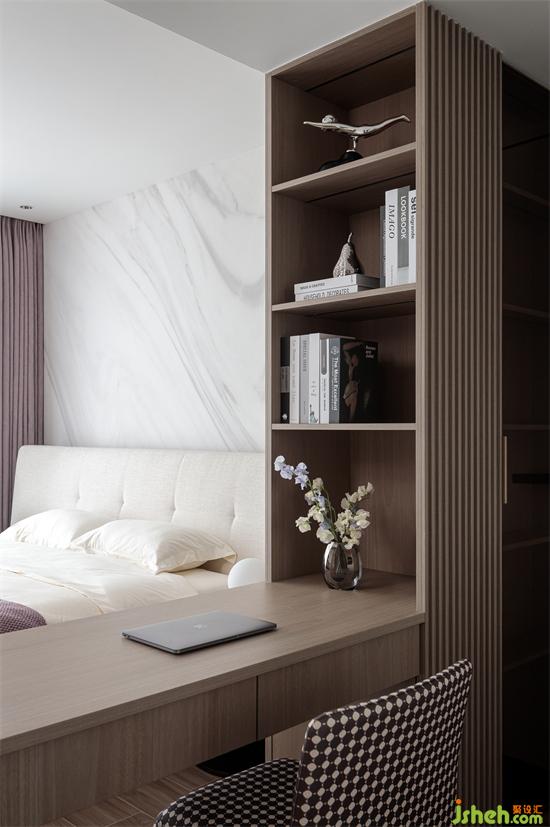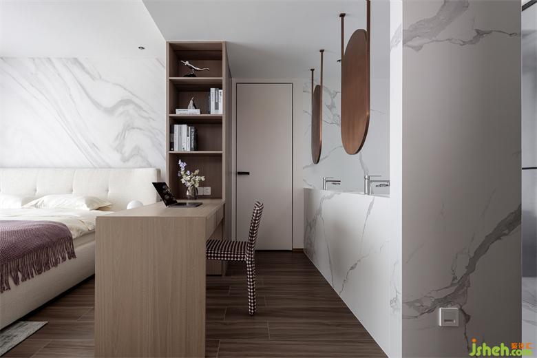 一如既往采用了咖啡色與白色的搭配,營(yíng)造低調(diào)而靜謐的入眠空間。國(guó)賓上院家裝設(shè)計(jì)將衛(wèi)生間、書桌、睡眠區(qū)域打通連接處理,并通過輕隔斷讓空間既通透明亮、又富有層次感,同時(shí)營(yíng)造出慵懶時(shí)尚的居家氛圍。