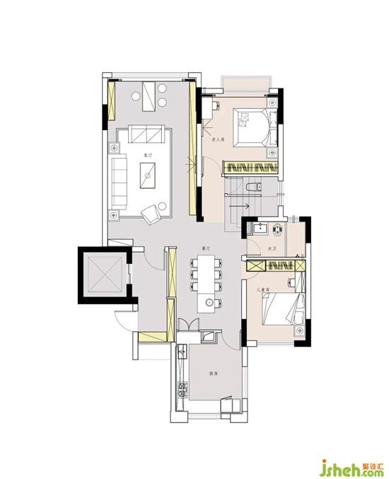 1.一樓空間要同時(shí)解決廚房采光差、空間狹小,位置居中、整個(gè)空間布局不合理等問(wèn)題。