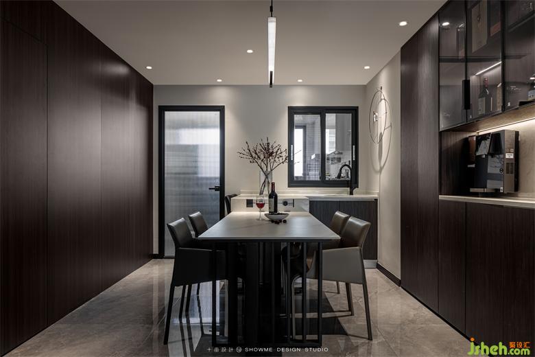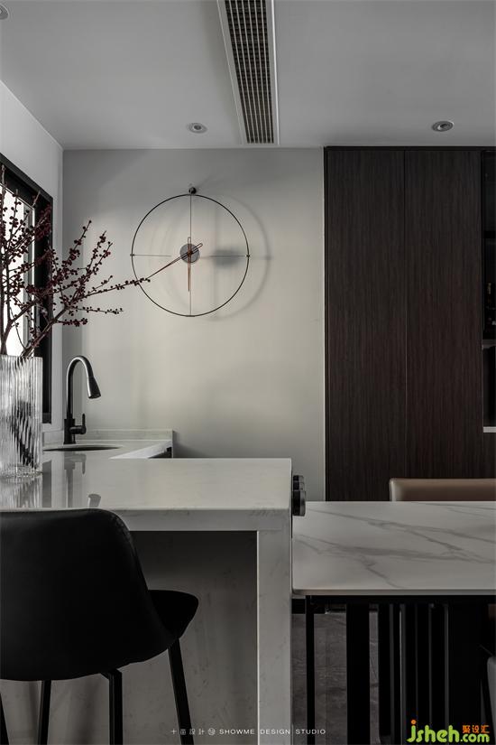 通過結構調整,將廚房區(qū)域移動至生活陽臺,金科王府家裝設計在原有位置打造出吧臺+餐廳的用餐區(qū),釋放空間,觀感上更顯開闊。