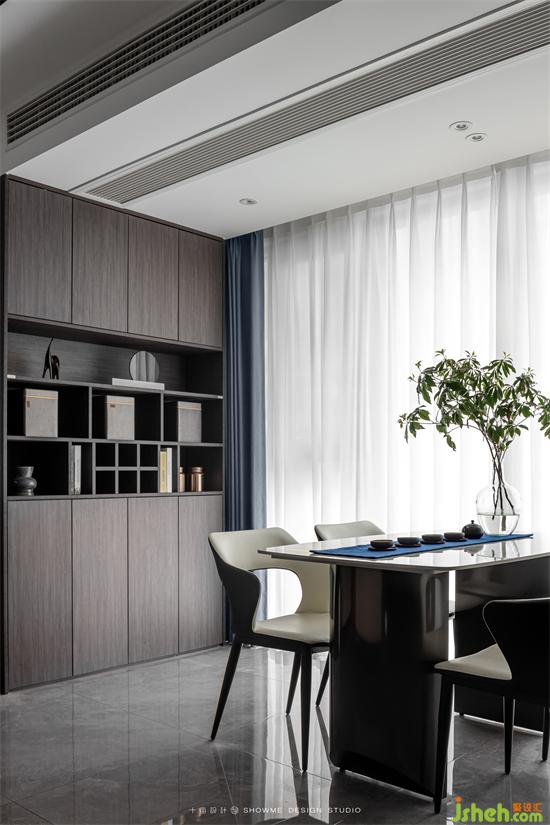 餐桌、餐邊柜和工具臺的布局規(guī)矩有致,金科王府家裝設計讓餐廚空間給人落落大方、潔凈干練之感。