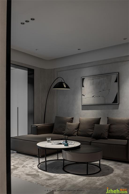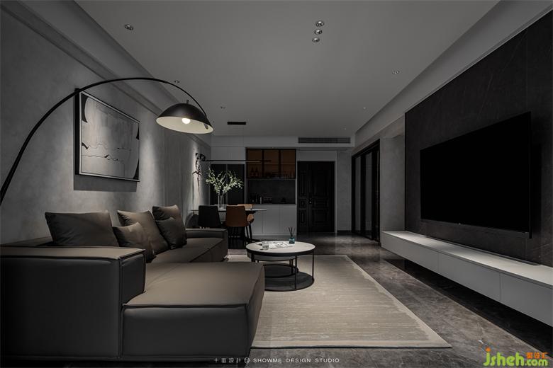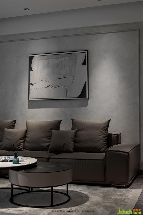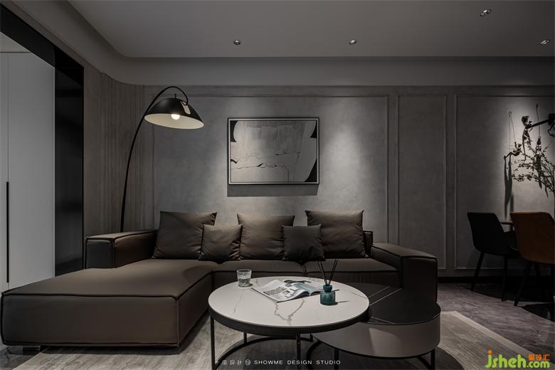 黑白灰搭配出來的效果從來都不會差。經(jīng)典的配色給客廳奠定了沉穩(wěn)大氣的旋律,地面用深色條紋亮面磚更是一種大膽的選擇。