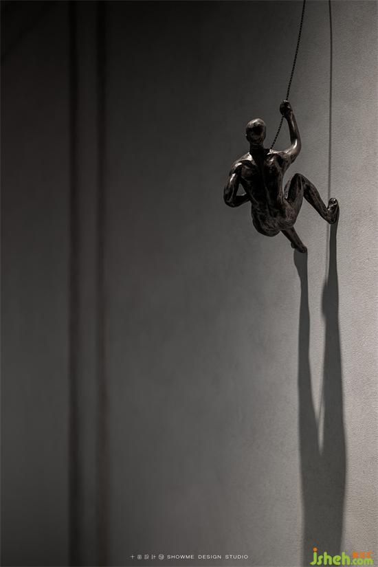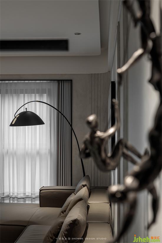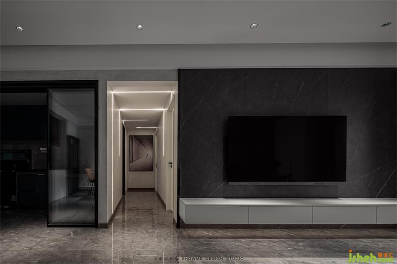 廊道區(qū)主色調(diào)是白色,與客餐廳區(qū)域形成鮮明的對比,寓意時空的變換交替,是從生活區(qū)到休息區(qū)的過渡,盡頭的掛畫與走廊呼應(yīng),營造出一種意猶未盡之感。