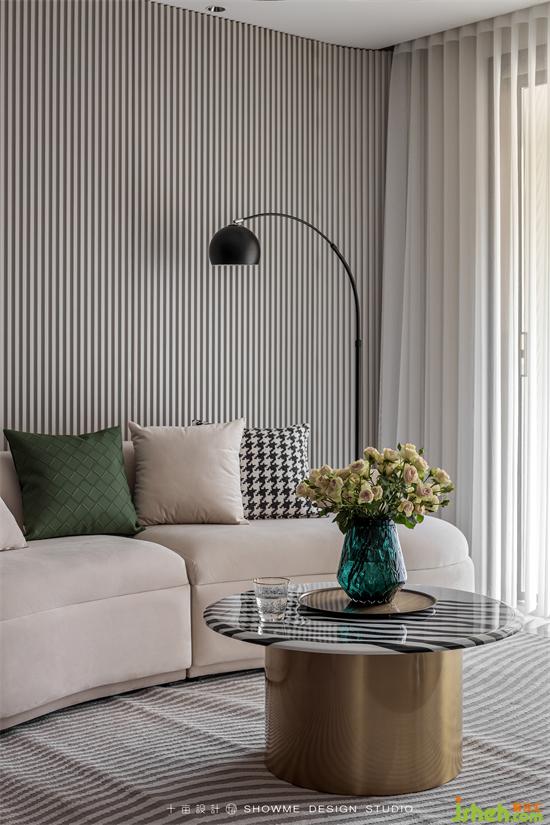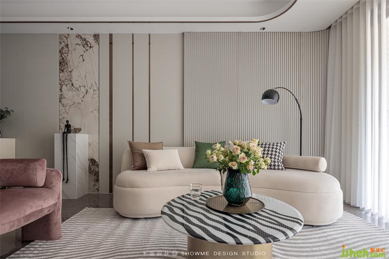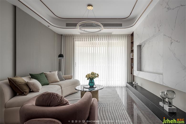 淺咖的底色基調(diào)讓空間治愈感滿滿,沙發(fā)背后大面積的墻面通過同色系的墻板、格柵、巖板搭配嵌入式燈光、金屬條,增加墻面層次的同時又不繁瑣,頤和上院家裝設(shè)計質(zhì)感、觀感、時尚感同步在線。