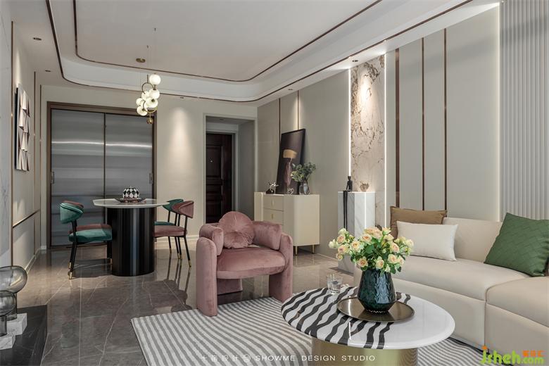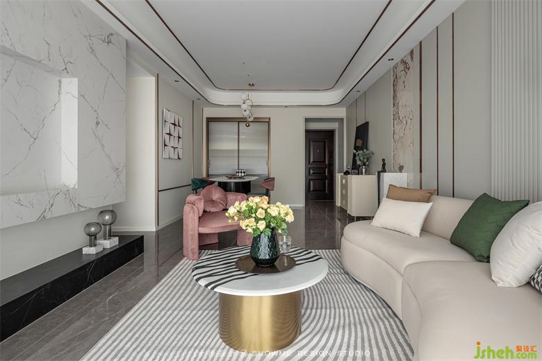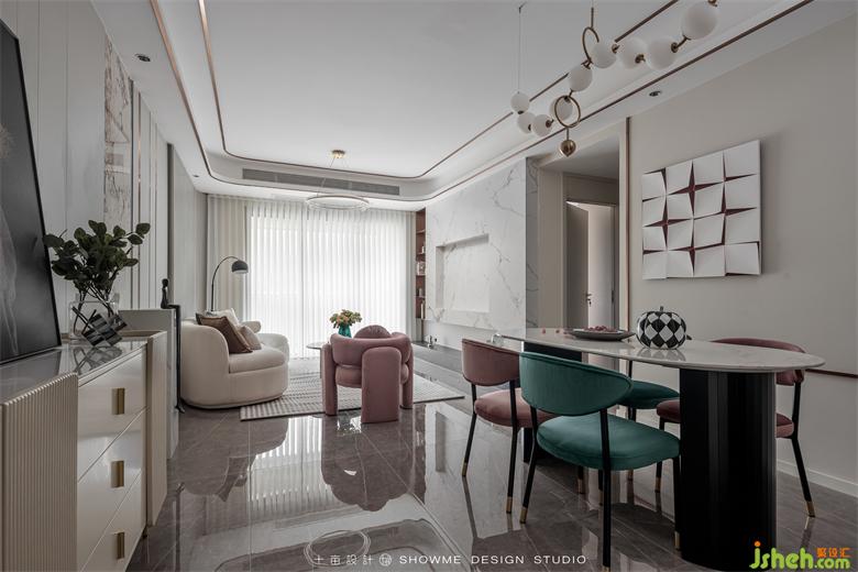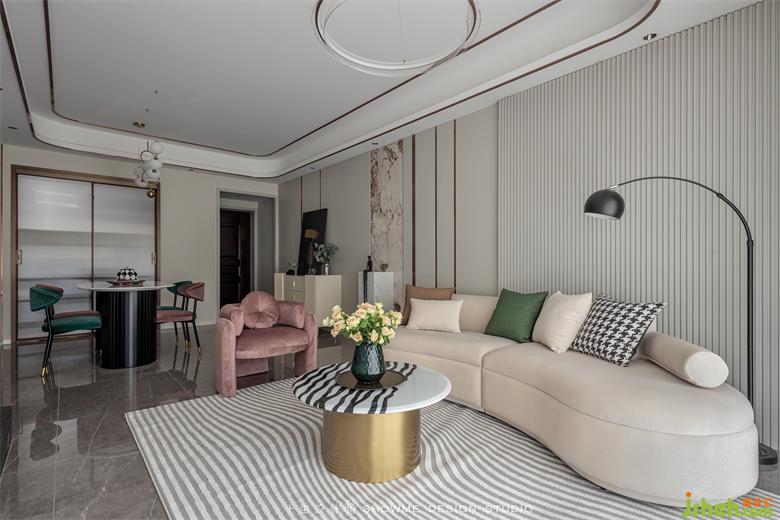 圓弧形吊頂柔美平和,主燈造型簡潔大方,頤和上院家裝設計讓空間感更添幾分中庸氣息。