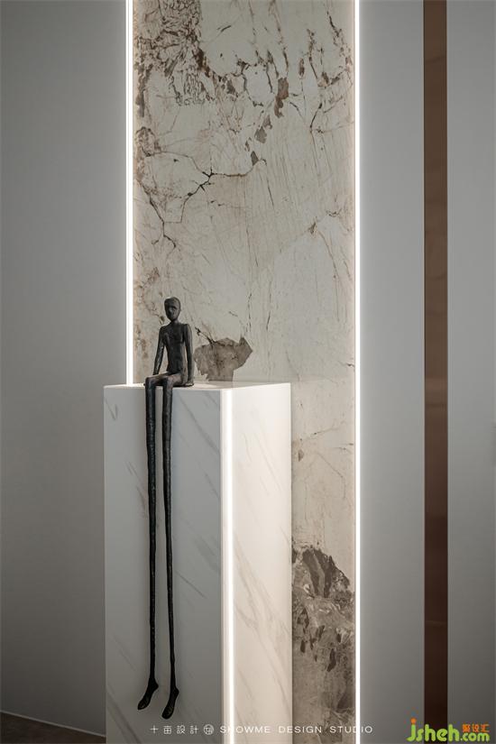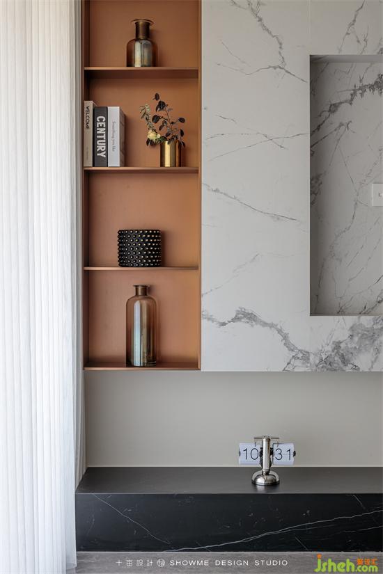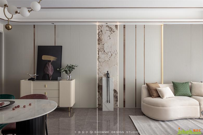 電視背景墻才用了當下最流行的白色巖板材質(zhì),與黑色的地臺形成色彩上的鮮明反差。