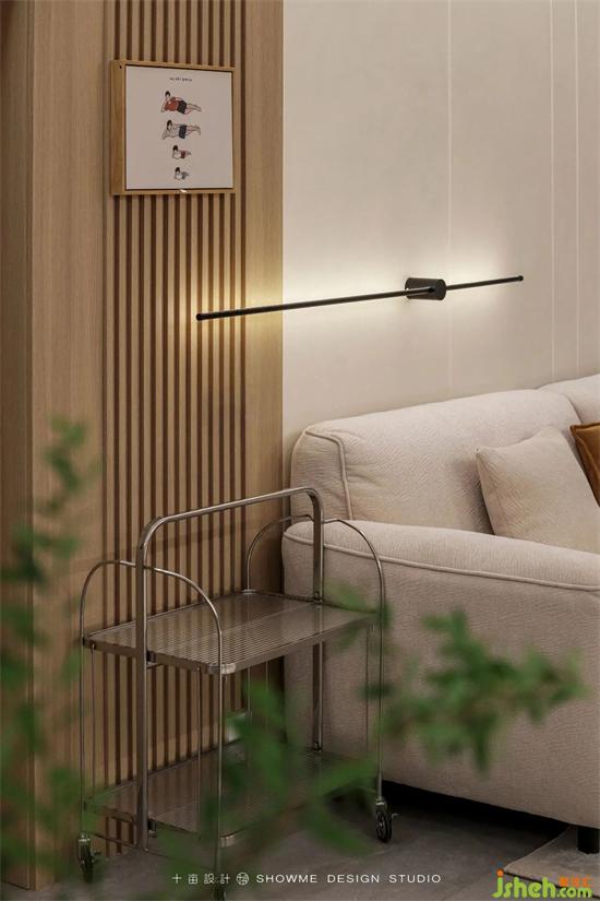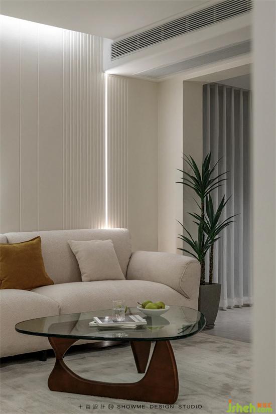 沙發(fā)背景墻采用木紋凹凸隔板與立體藝術(shù)漆搭配,國賓上院家裝設(shè)計用簡單的線條勾勒出空間層次感。