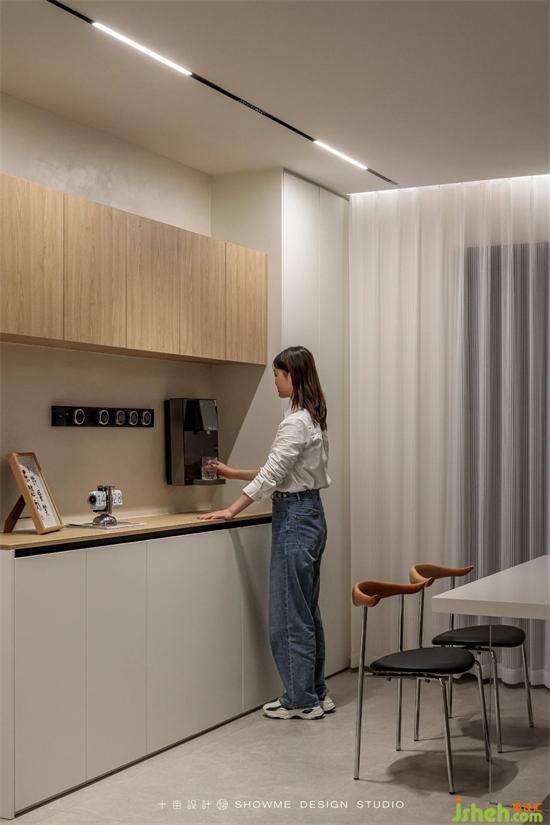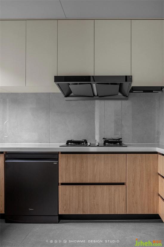 廚房的色彩搭配,與整體的原木風(fēng)格融合在一起,顯得溫潤雅致。吸頂油煙機的造型十分特別,顏值滿滿,讓人眼前一亮。