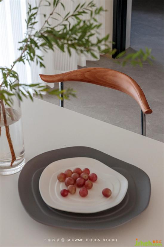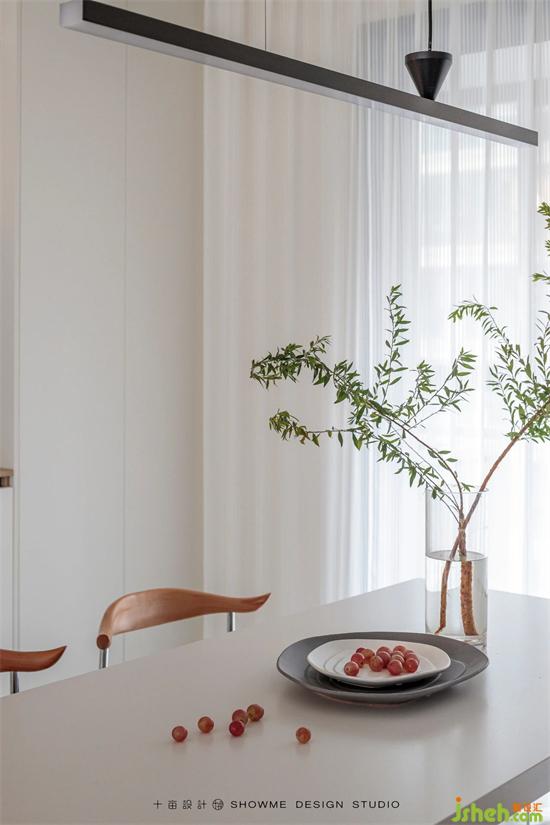 餐桌位于區(qū)域正中,透明的桌腿設(shè)計襯著白色的光,桌面如懸空一般,國賓上院家裝設(shè)計有一種別樣的夢幻。