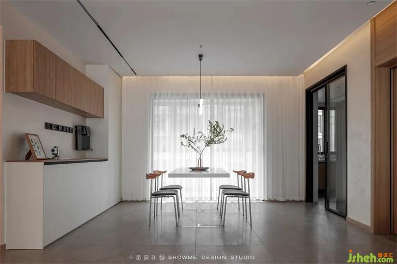入戶的左手邊是餐廳區(qū)域,方正的格局讓用餐空間顯得特別開闊明亮。