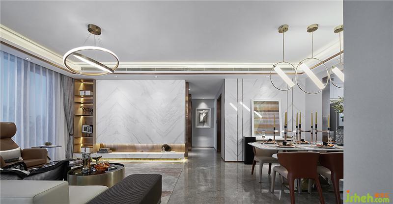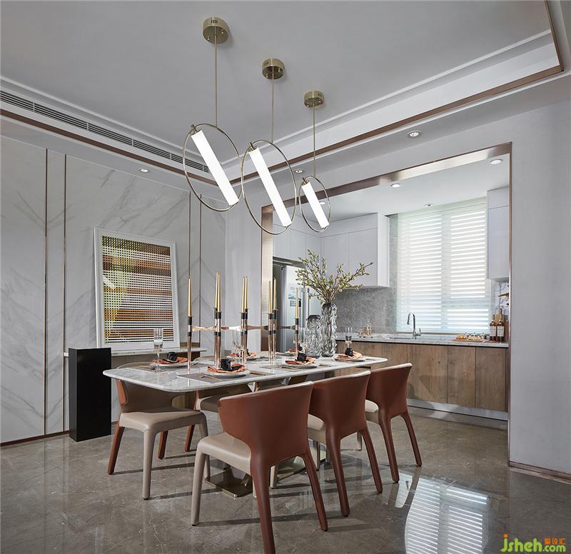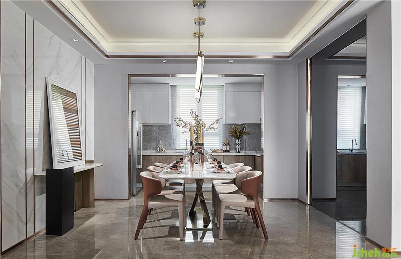 客廳空間的設(shè)計(jì),通過塊面和線條的塑造使其更具包容性。天花設(shè)計(jì)不銹鋼疊級(jí)與墻面豎向的不銹鋼收邊,突顯了空間的層次感與立體感。白色大理石增設(shè)嵌入式展示柜,使空間更為整體大氣。
