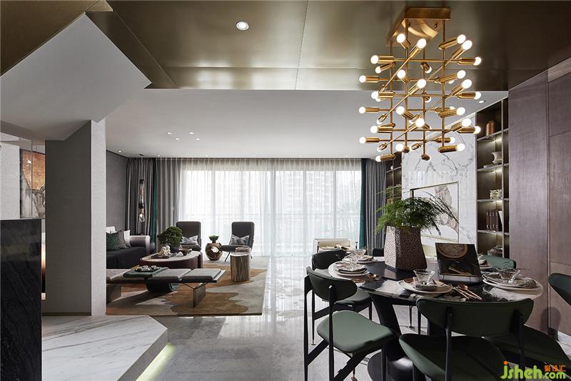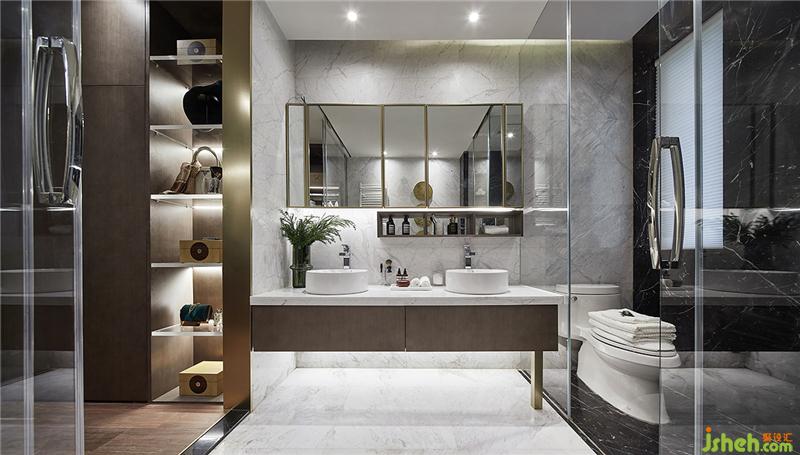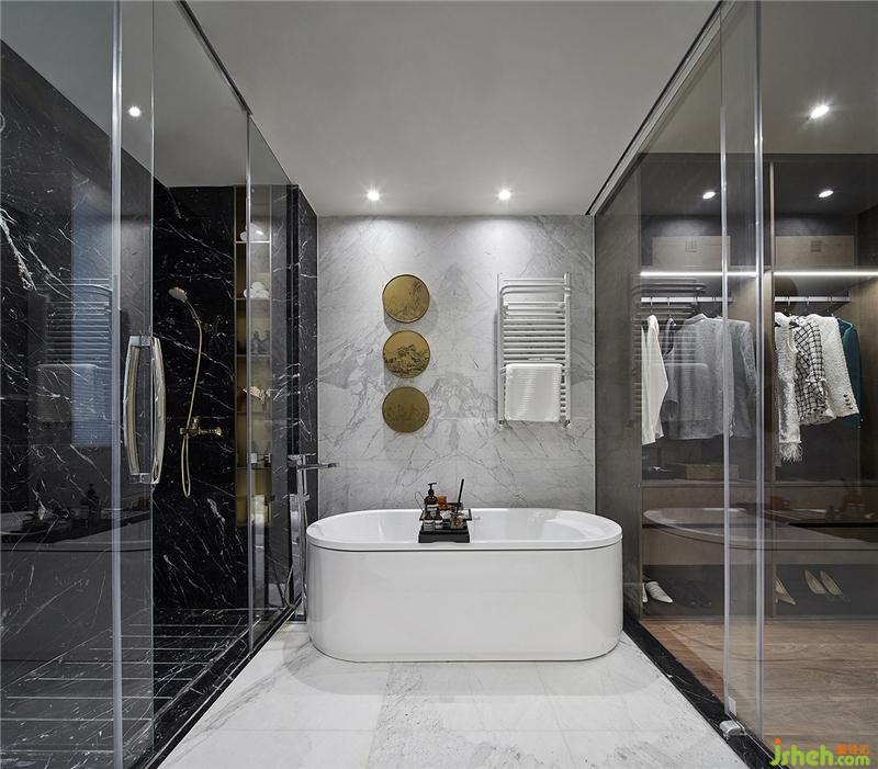 爵士白、黑白根大理石與古銅拉絲不銹鋼的搭配相得益彰,對比鮮明,散發(fā)出通透簡約的高貴質(zhì)感。