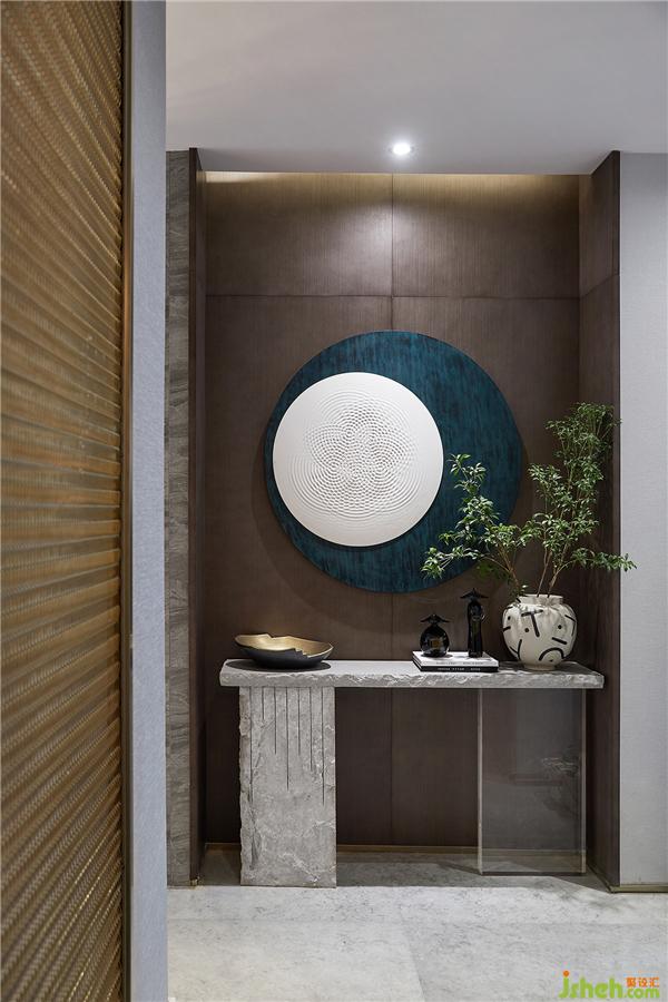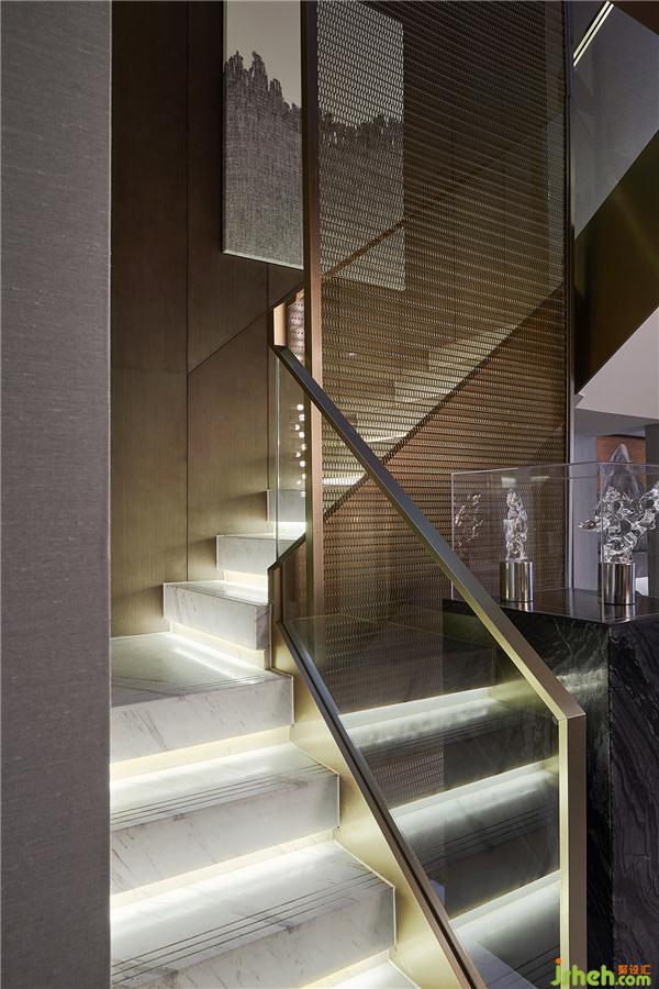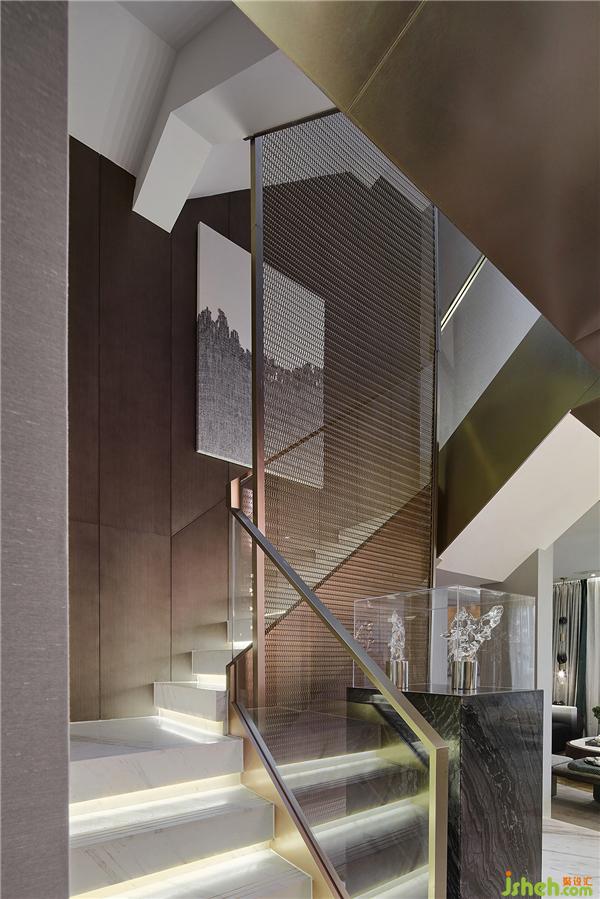 樓梯裝置以通頂金屬網(wǎng)為隔斷,視線未被完全阻隔,客餐廳與景觀陽臺隱約窺見。整個門廳收放有序,以東方理念的當(dāng)代演繹,將喧囂褪去,讓所有感官在靜謐中自由舒緩。