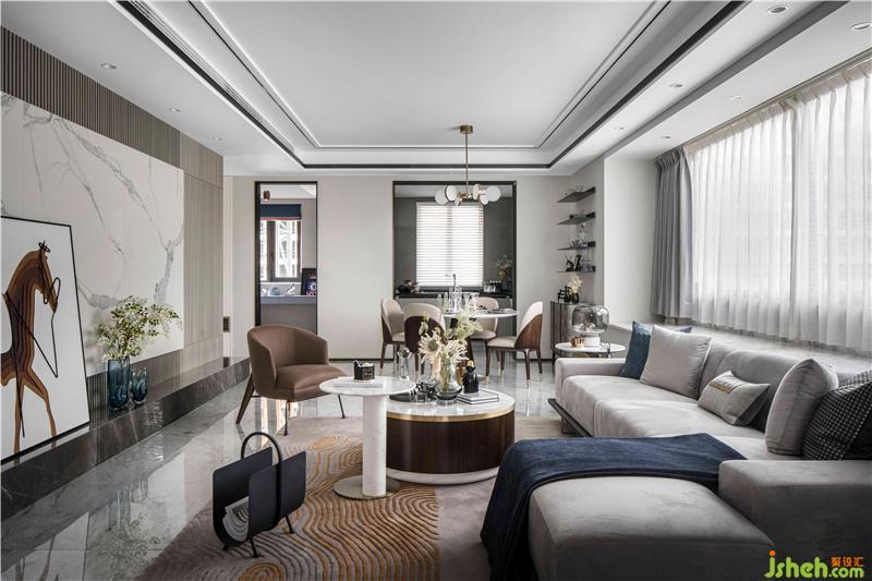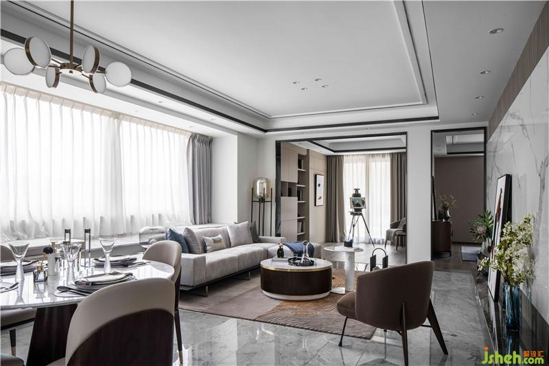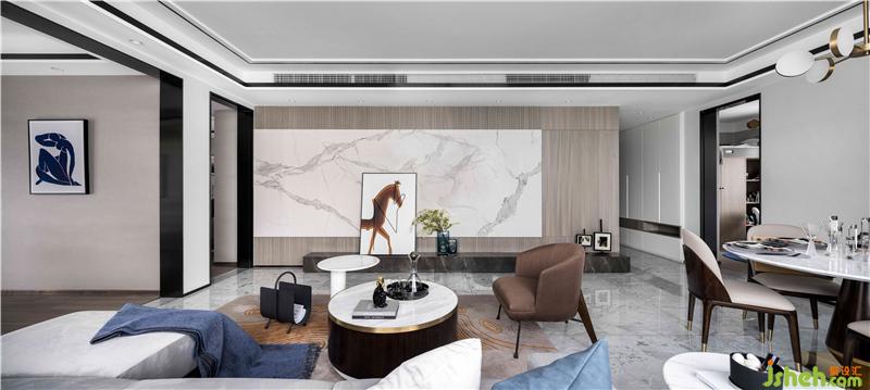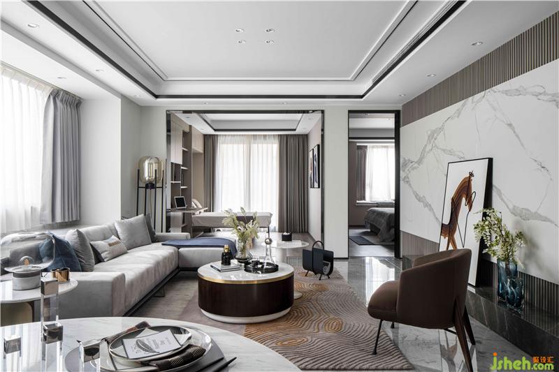 客廳大理石背景墻的天然肌理與淡雅溫和的木飾面相結(jié)合,二者質(zhì)感對立卻相互融合,營造出空間的默契感。樣板房設(shè)計