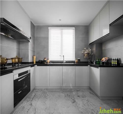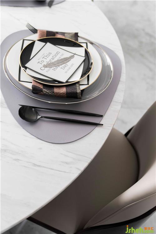 開放式廚房餐廳延續(xù)了客廳的主色調(diào),二者既互通相連,又各自具有空間的獨(dú)立性。營造輕松但不失品質(zhì)的就餐氛圍。深色木飾面搭配灰白色皮質(zhì)的座椅與玻璃質(zhì)感的吊燈和餐桌飾品搭配,來自廚房與客廳的光線同時傾入,帶來更多溫暖體驗(yàn)。樣板房設(shè)計
