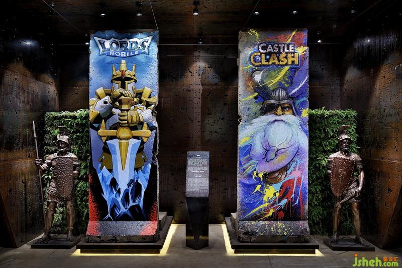 在設計初期,我們設計公司還和IGG就談到了一個共同的概念,那就是柏林墻。柏林墻作為自由的象征,是人類一直以來的追求,時刻提醒IGG不要忘記自己的追求,也就是不忘初心制造快樂娛樂玩家的企業(yè)精神。為此業(yè)主在外國訂購了兩座拆除的柏林墻,我們設計公司了解其深意后,決定把它們豎立在辦公樓的入口正前方,并且請畫師在柏林墻上繪制了目前IGG最熱門的兩款游戲《城堡爭霸》、《王國紀元》。