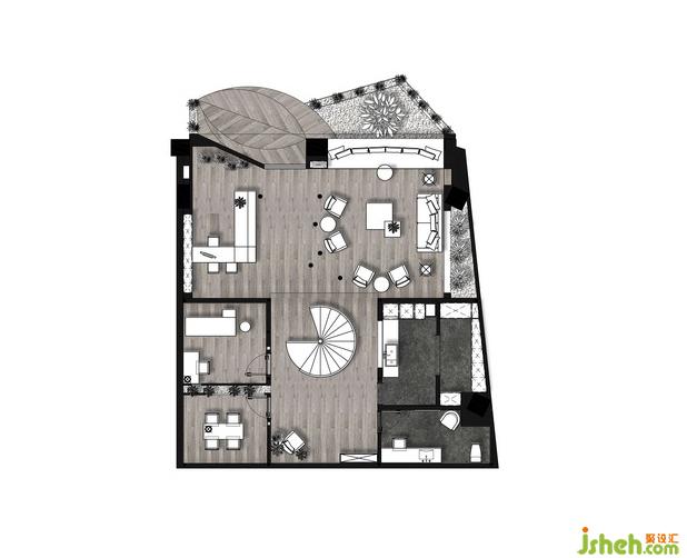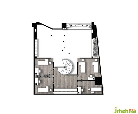 整個空間入口及休閑區(qū)室內(nèi)設(shè)計師做了一個抬高,將空間的公共區(qū)域和內(nèi)部區(qū)域做了一個劃分。整個空間的中心點(diǎn)是連接一二層的飄帶狀旋轉(zhuǎn)樓梯。