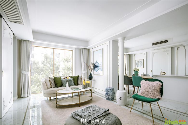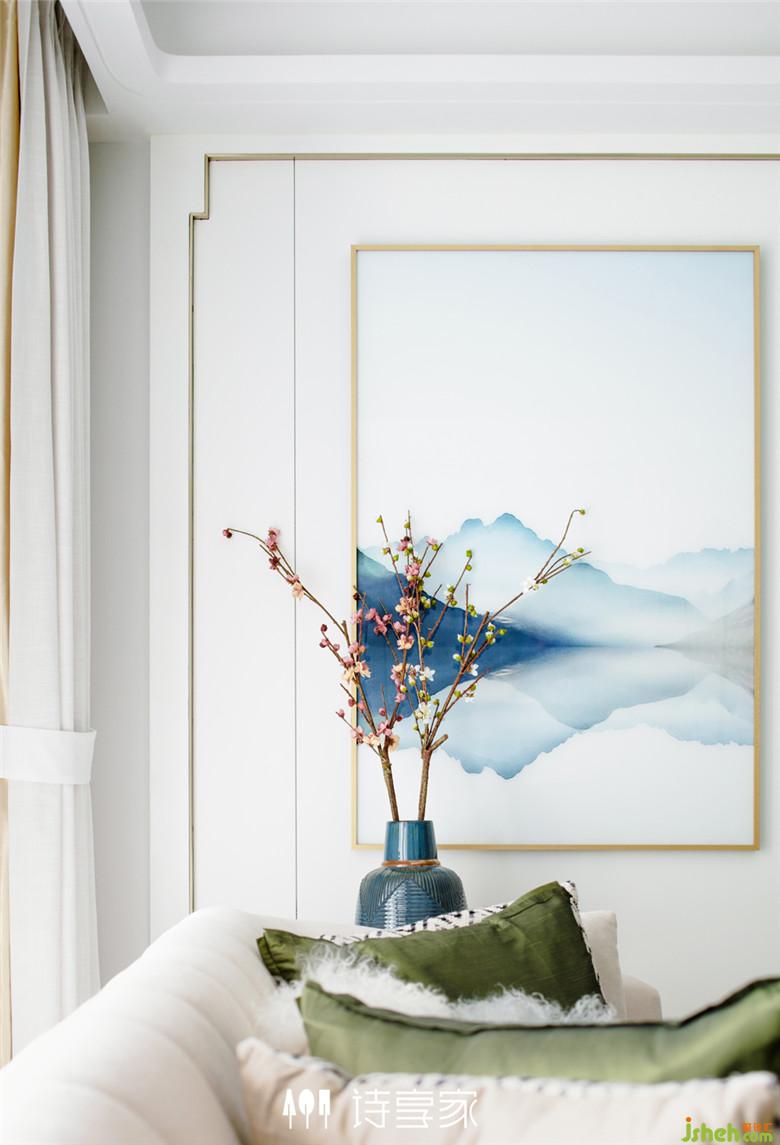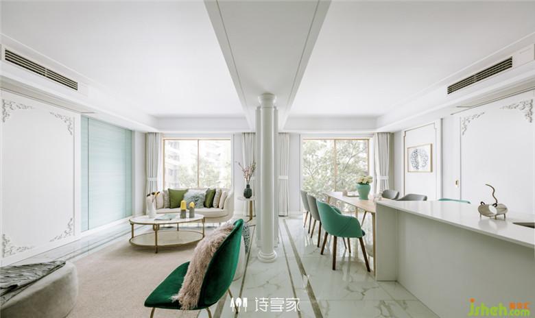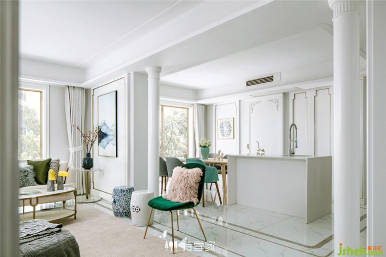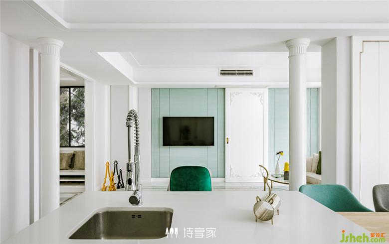 島臺邊的酒柜可以放一下零食、酒水和做點心用的原料和工具方便拿取和收納,餐桌邊的餐邊柜可以放一些餐具也是一個很美觀的裝飾品。室內設計師考慮到三代人除了日常生活的交流外,在休息時還需要各自獨立的空間,就在客廳和餐廳分別通往房間的過道位置各加了一扇門移門。