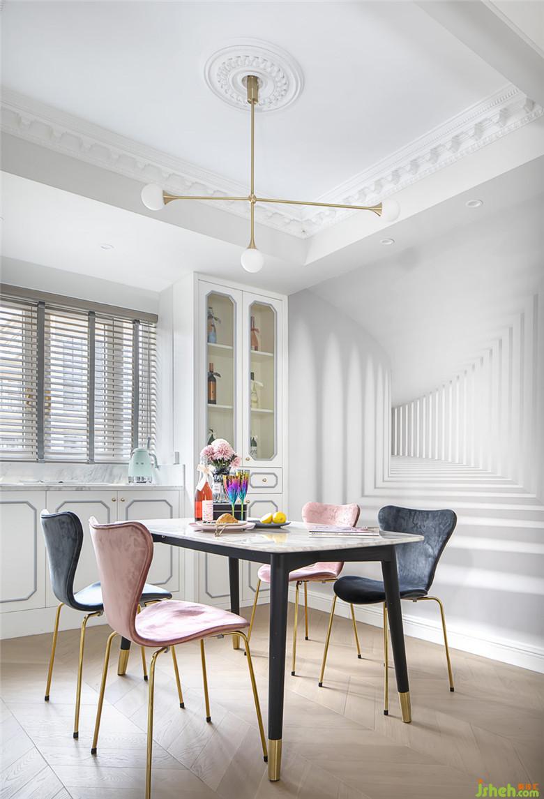 業(yè)主目前是自己一個人住這里,會有父母或者親戚來小住。業(yè)主是個會跳舞的吃貨,有跳舞室和西廚的需求,餐桌室內(nèi)設(shè)計師也是搭配業(yè)主的喜好的顏色,粉色搭配黑色的餐椅,以及藝術(shù)墻,藝術(shù)感溢出。