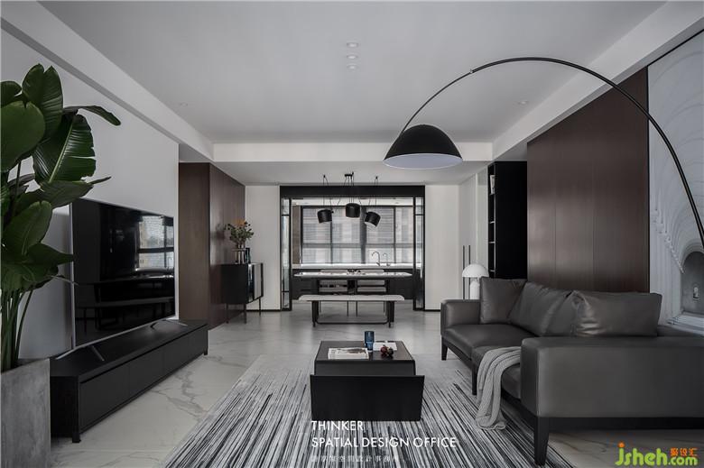 室內(nèi)設(shè)計(jì)師拆掉通往陽(yáng)臺(tái)的門,盡可能打開空間,從陽(yáng)臺(tái)到客廳再到餐廳廚房,流暢的空氣與深棕色帶來(lái)的沉穩(wěn)安全感,如秘境般讓人獲得身心歸屬。