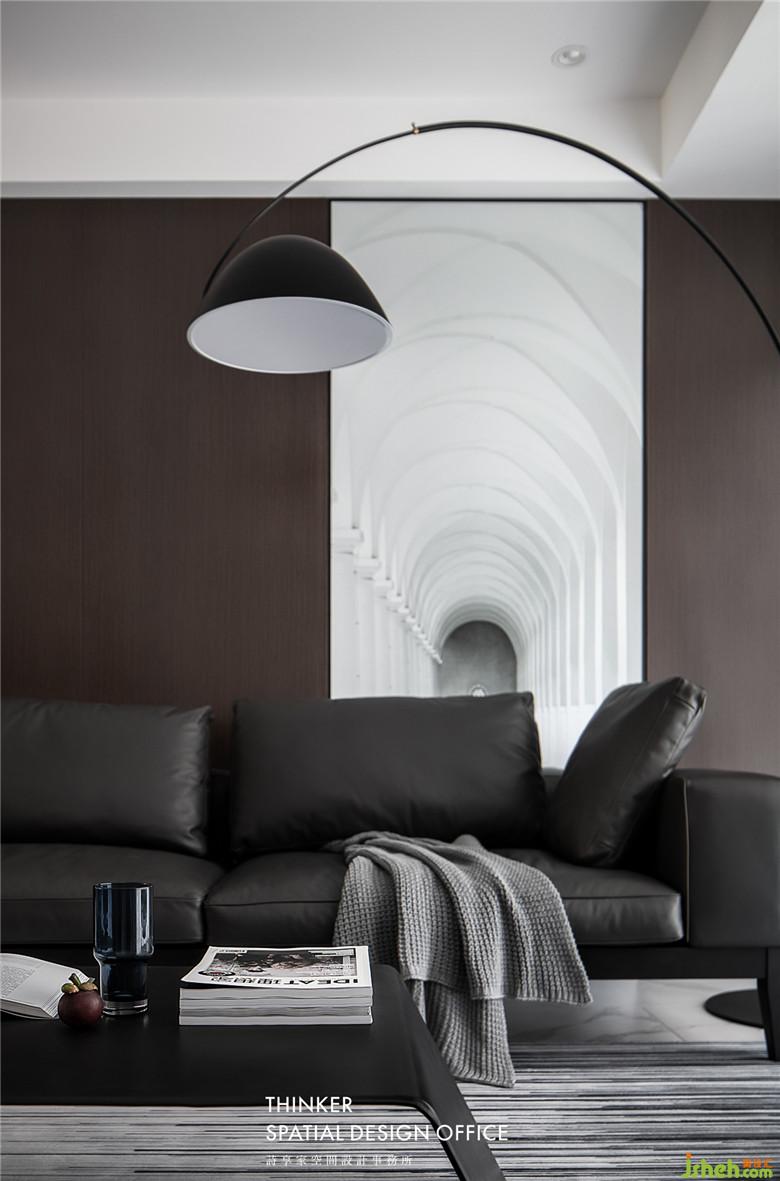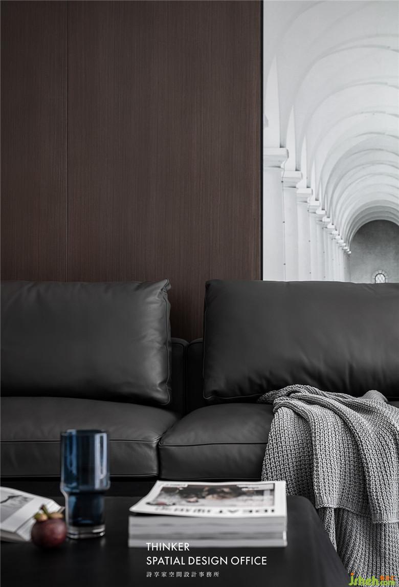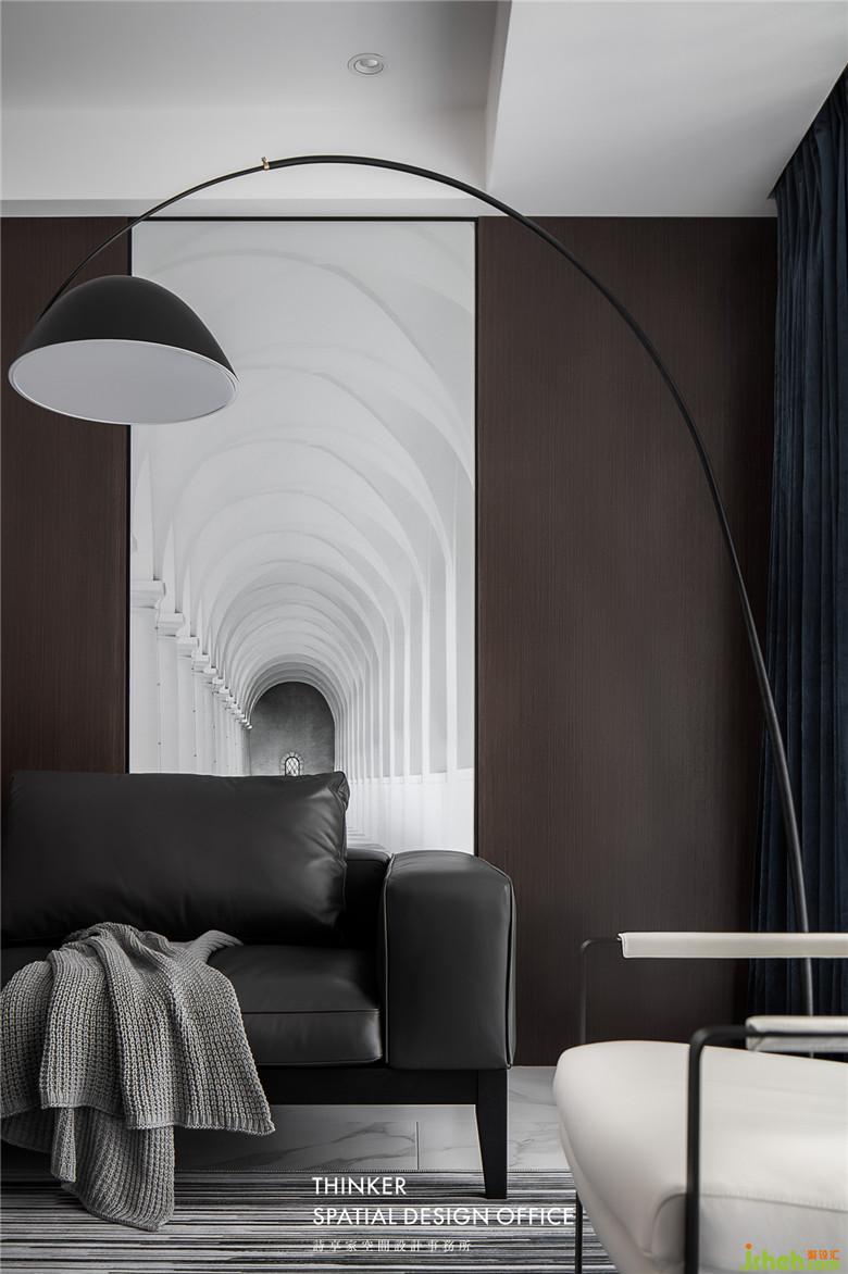 家具款式簡(jiǎn)約明了,沙發(fā)皮革的質(zhì)感與墻面黑胡桃木紋碰撞,帶來(lái)硬朗卻又溫潤(rùn)的時(shí)尚感;定制的建筑透視畫,產(chǎn)生虛實(shí)結(jié)合的視覺體驗(yàn),同時(shí)提亮了客廳的整體色調(diào)。