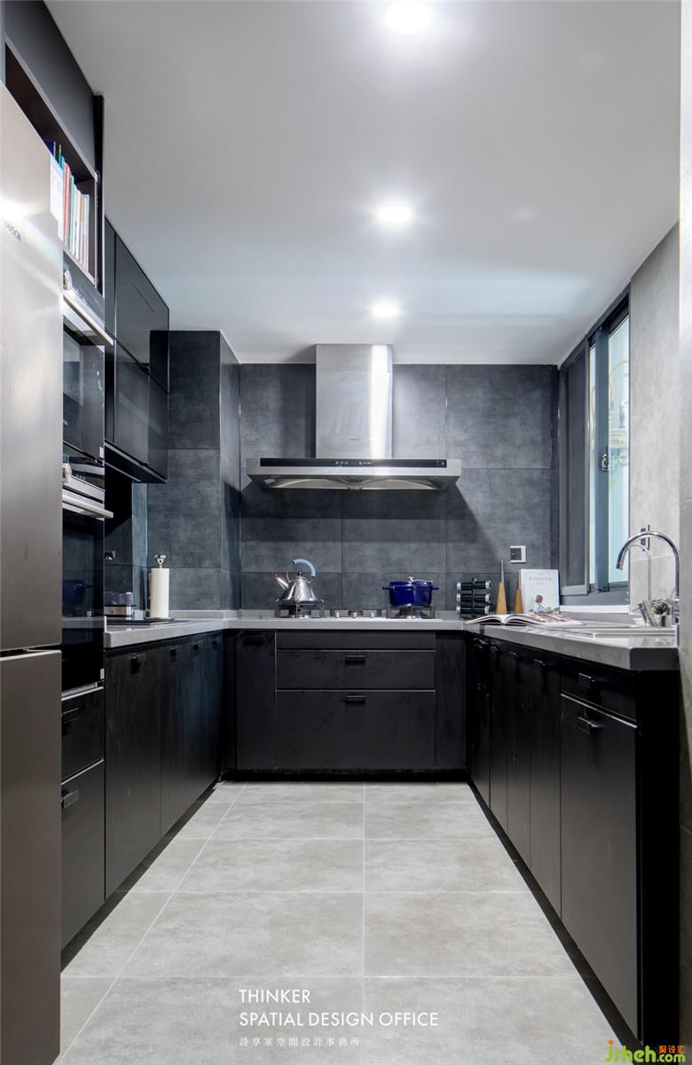 水泥磚帶來素樸的質(zhì)感,純黑色櫥柜與客餐廳色調(diào)呼應(yīng),沉穩(wěn)大氣。