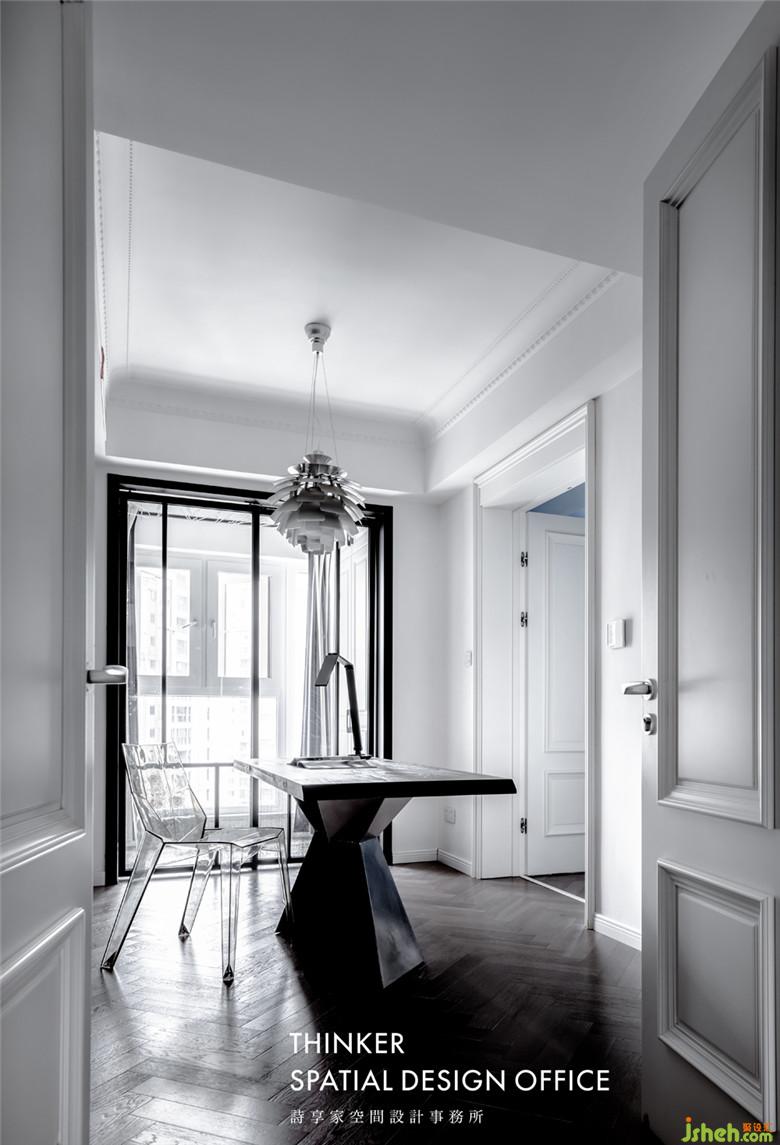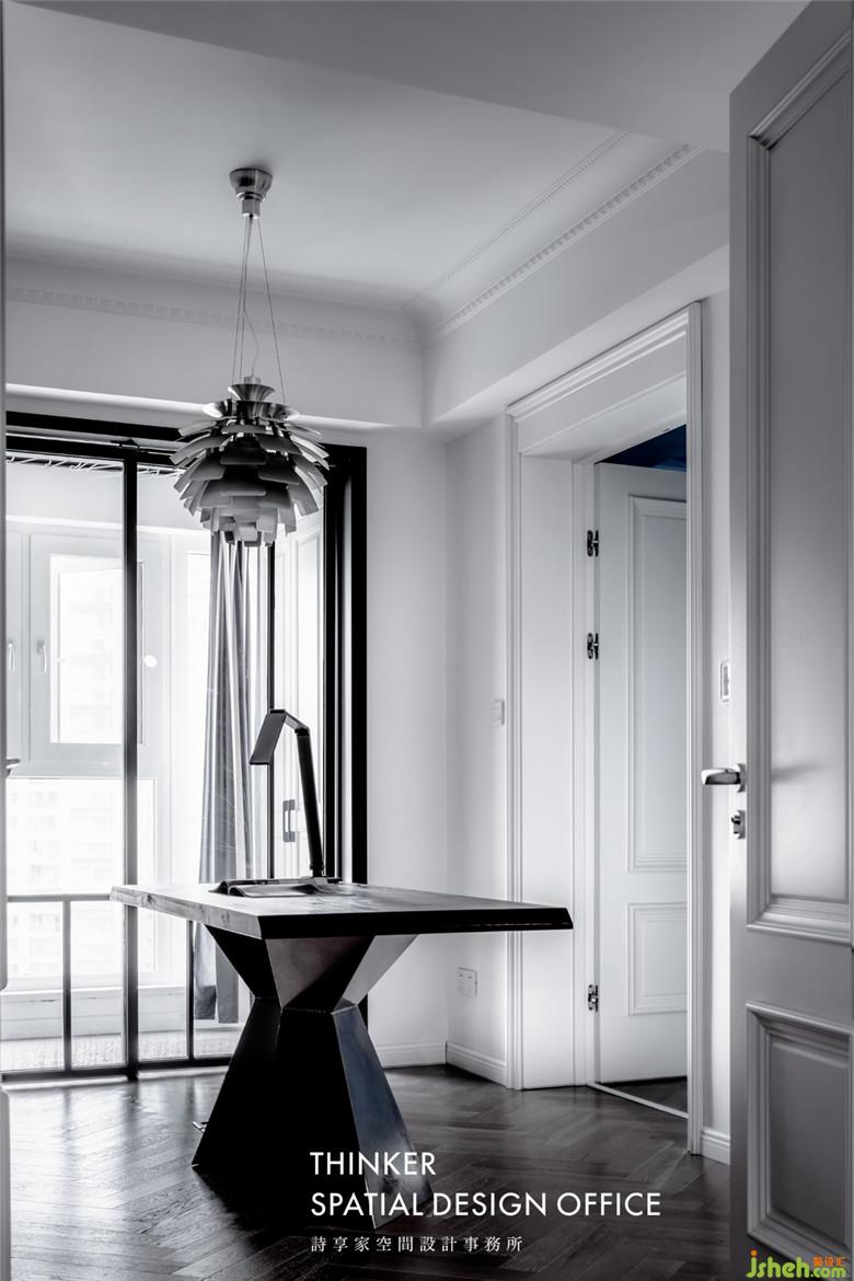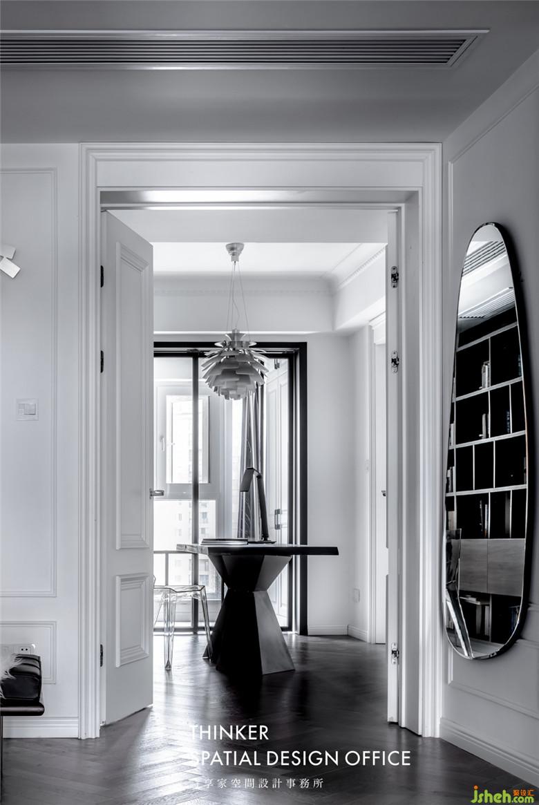 穿過大氣的挑高雙開木門,通往主人的私密空間。在這個書房中,黑白分明的材質(zhì),室內(nèi)設(shè)計師以極簡的方式構(gòu)成空間底色,精致的線條勾勒出優(yōu)雅的空間輪廓。