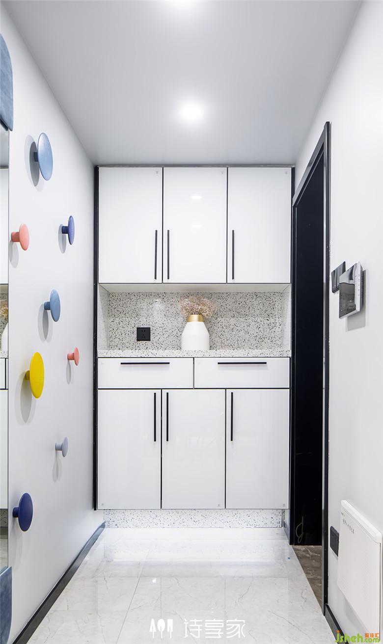 門(mén)廳空間不大,但鞋柜、掛衣架及穿衣鏡功能齊全,使用方便。以白、灰為主基調(diào),充滿童趣的彩色掛衣架為空間增添了活潑的色彩。