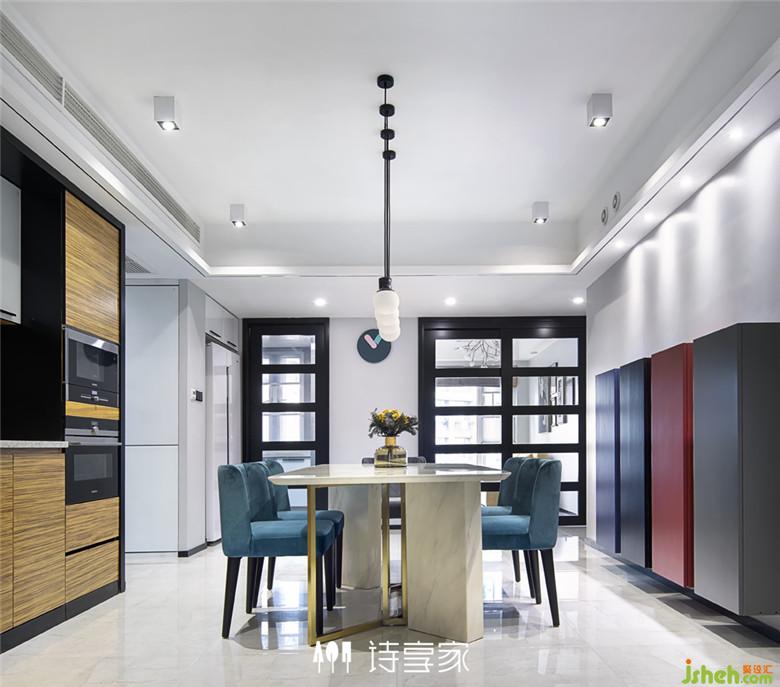 室內(nèi)設(shè)計(jì)師將廚房的長(zhǎng)度縮小,增加寬度,讓臺(tái)面操作比較方便、集中。同時(shí)擴(kuò)大了餐廳空間,讓整體動(dòng)線更加流暢。然后在公共區(qū)域增加西廚臺(tái)面,彌補(bǔ)廚房臺(tái)面的不足,同時(shí)充當(dāng)茶水柜,餐邊柜的功能。
